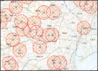 円やフリーハンドで作成した商圏内の統計データを集計します。複数の商圏を一括で先制する機能や指定した統計値を満たす商圏を作成する逆算機能など多様なマーケティング分析が可能です。